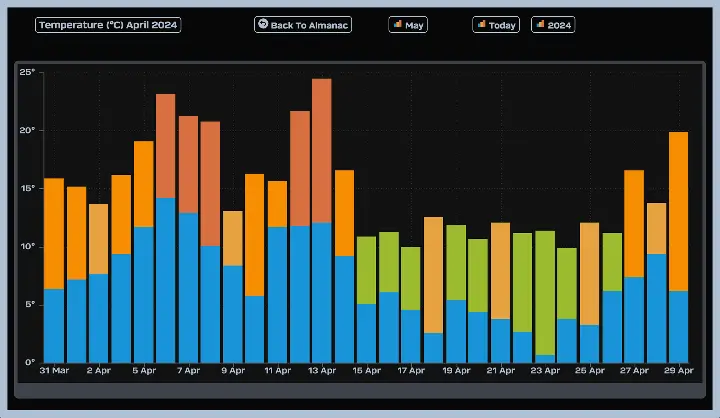 De gemiddelde temperatuur voor april 2024 bedroeg 11,2 graden Celsius, met een maximum van 24,5 graden en een minimum van 0,7 graden Celsius. Deze maand bracht een verscheidenheid aan temperaturen met zich mee, van warme lentedagen tot koele nachten die nog een vleugje winter in zich hadden.