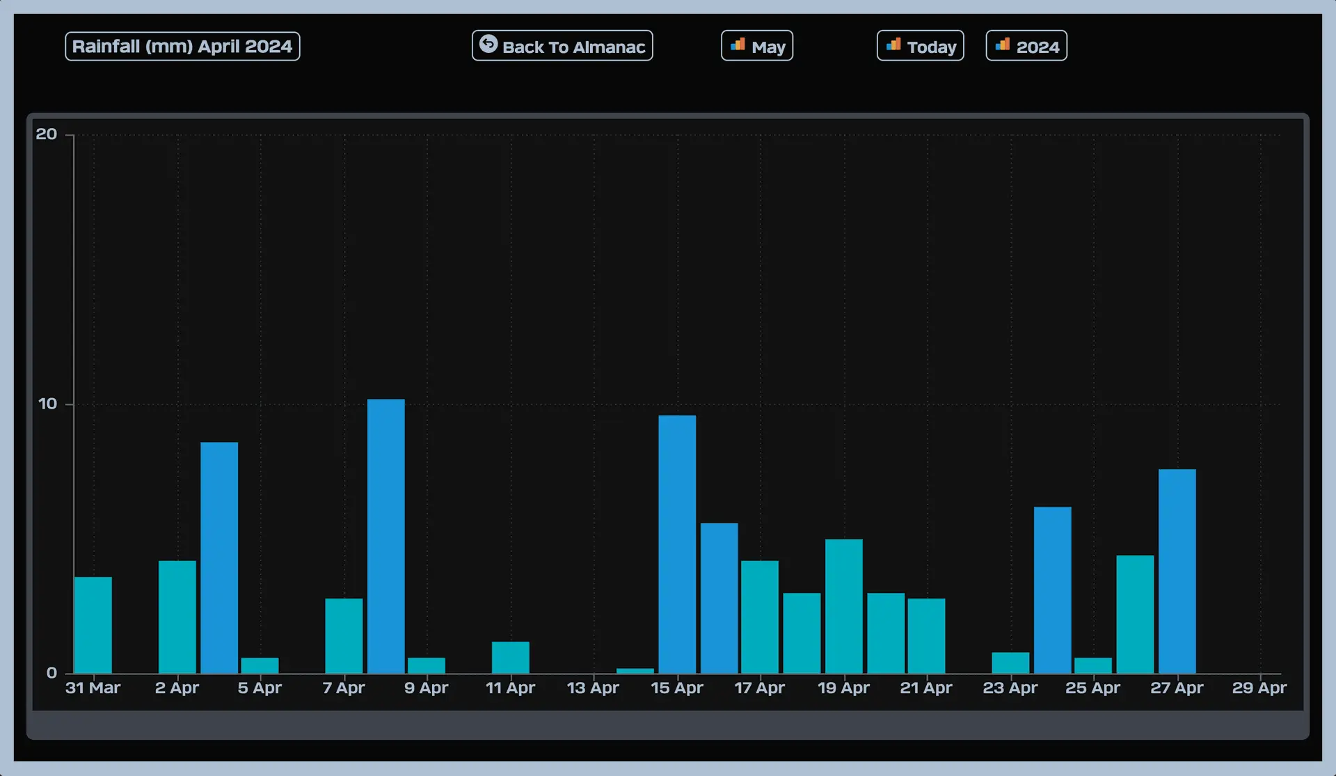 April staat bekend om zijn wispelturige regenbuien, en dit jaar was geen uitzondering. In totaal registreerden we 88,66 mm neerslag, verspreid over 21 dagen van de 30. Deze neerslag heeft de natuur in Tielt weer laten bloeien en groeien na de droge wintermaanden.