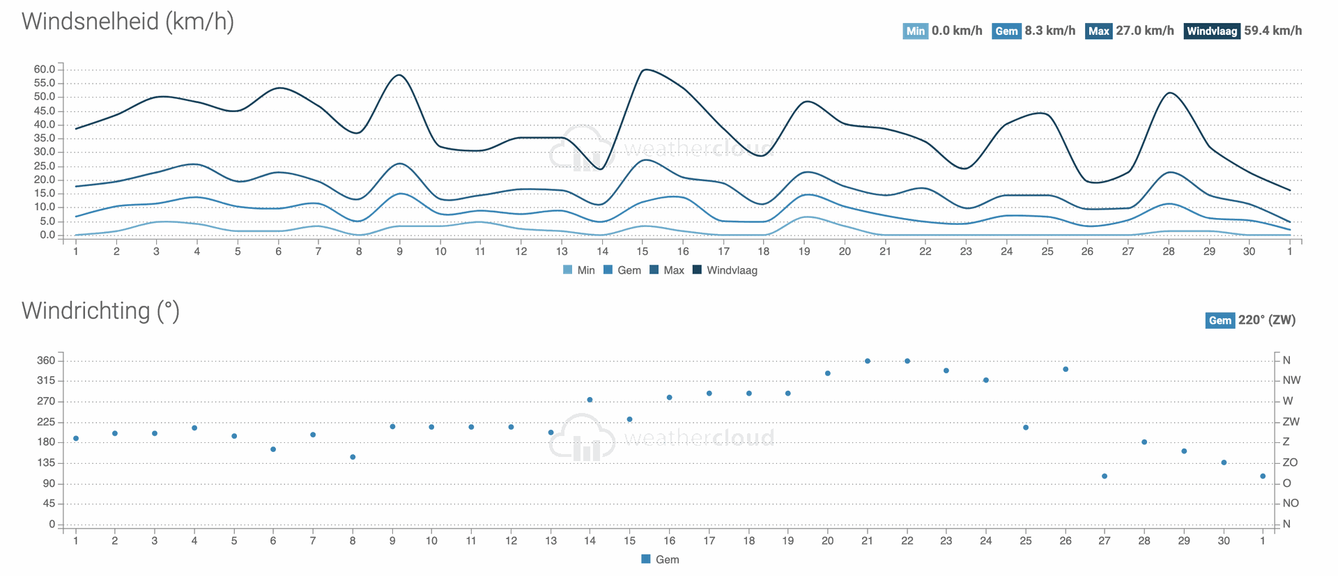 De wind speelde ook een rol in het weerbeeld van april, met een maximale windsnelheid van 57,9 km/u, vergezeld van rukwinden tot 59,5 km/u. De gemiddelde windsnelheid bedroeg 8,3 km/u gedurende de maand. Deze winderige dagen brachten soms een extra frisse noot mee, maar voegden ook dynamiek toe aan het weerlandschap.
