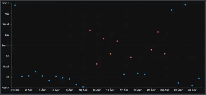 De windrichtingen wisselden typisch voor april. Begin en einde van de maand kwamen de winden voornamelijk uit het noordoosten en oosten, wat frissere en droge lucht bracht. Midden april draaide de wind naar het zuiden en zuidwesten, wat samenviel met zachter, wisselvalliger weer.