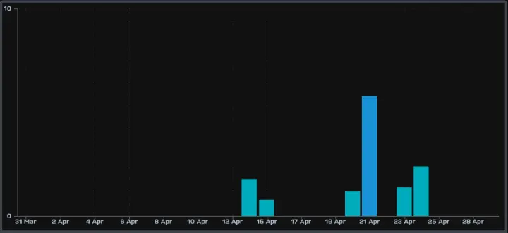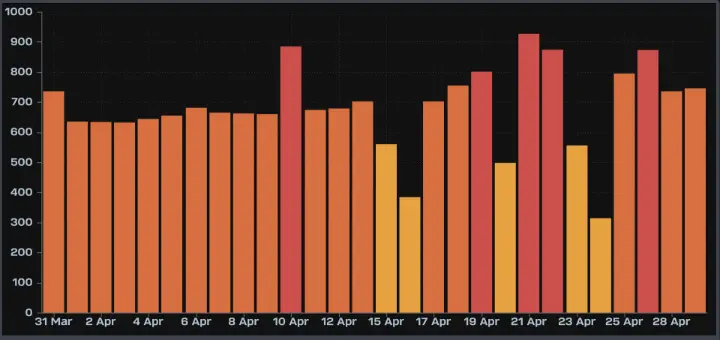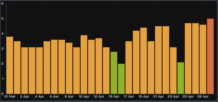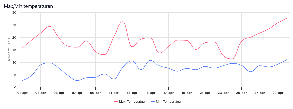 De UV-index lag meestal tussen 3 en 4. Op bewolkte dagen zoals 15 en 25 april daalde hij onder niveau 2. Eind april bereikte de UV-index een piek van 5 op 28 april – een teken van verhoogde zonkracht en nood aan bescherming.
