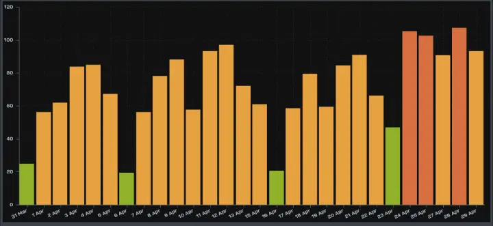 De luchtkwaliteit varieerde sterk. Begin april kwamen enkele goede dagen voor, afgewisseld met matige verontreiniging tot 85 eenheden. Na een korte verbetering midden april, verslechterde de situatie merkbaar vanaf 24 april. De laatste week kende meerdere dagen met slechte luchtkwaliteit (>100).