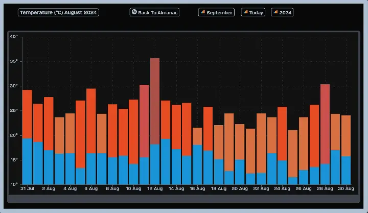 De gemiddelde temperatuur in augustus 2024 bedroeg 20,1 graden, wat aangenaam is voor de tijd van het jaar. De hoogste temperatuur werd gemeten op 12 augustus, met een zinderende 35,7 graden, terwijl de laagste temperatuur op 11,5 graden uitkwam. Over het algemeen waren de temperaturen gematigd, met slechts enkele dagen waarin de hitte piekte.