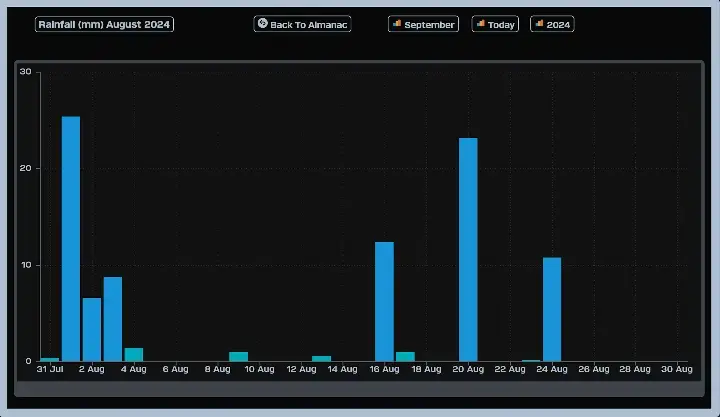Deze maand viel er 91,43 mm regen, verspreid over 11 dagen. Dit maakte augustus relatief nat, al bleef de regen voornamelijk beperkt tot enkele buien. De meeste regen viel rond 2 en 20 augustus, waarbij er flinke hoeveelheden neerslag werden geregistreerd.