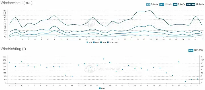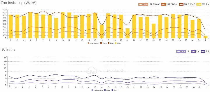 De zonnestraling gedurende augustus vertoonde een duidelijke variabiliteit. De gemiddelde dagelijkse zonnestraling over 24 uur was 177,2 W/m², met pieken die een maximum van 960,0 W/m² bereikten. Gedurende de maand schommelde de zonnestraling, met de meest zonnige dagen rond de 5e, 15e, en 28e augustus, waar de straling op sommige dagen boven de 900 W/m² lag. Er waren ook dagen met lagere zonnestraling, zoals rond de 17e en 21e augustus, waar de pieken lager waren en de gemiddelde waarden ook wat daalden. Het totaal aantal uren zonneschijn in de maand kwam uit op 289,2 uur, wat aangeeft dat augustus redelijk zonnig was, met enkele bewolkte perioden.