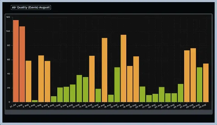 In augustus varieerde de luchtkwaliteit in Tielt aanzienlijk. De maand begon met hoge vervuilingsniveaus, met een piek op 1 augustus, waarbij de luchtkwaliteitsindex (AQI) meer dan 100 bereikte. Gedurende de eerste week daalden de waarden geleidelijk, maar er waren meerdere dagen met matige vervuiling. Halverwege de maand was er een verbetering, met meerdere dagen waar de luchtkwaliteit als goed werd beoordeeld (groene balken). In de tweede helft van de maand waren er opnieuw pieken, vooral op 15, 18, 28 en 29 augustus, waarbij de AQI weer boven de 80 uitkwam. De maand eindigde met matige luchtkwaliteit.
