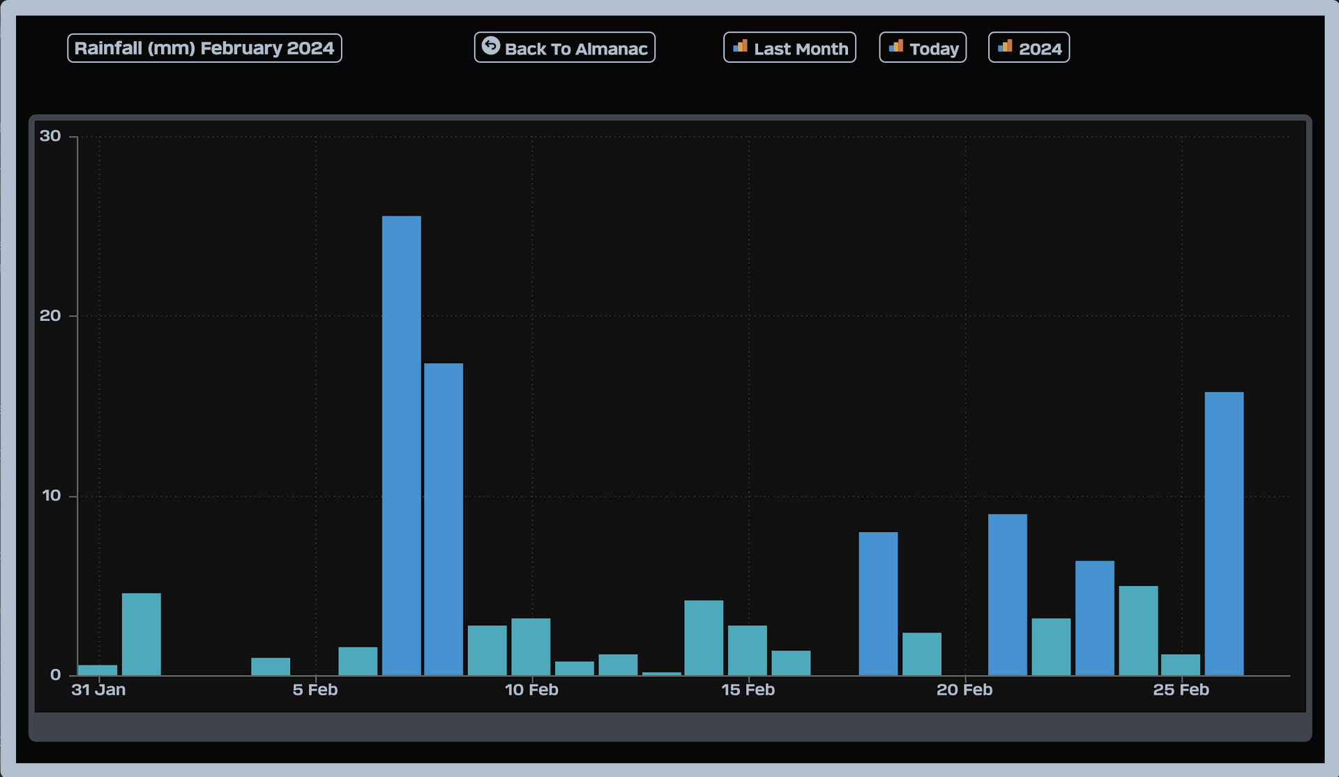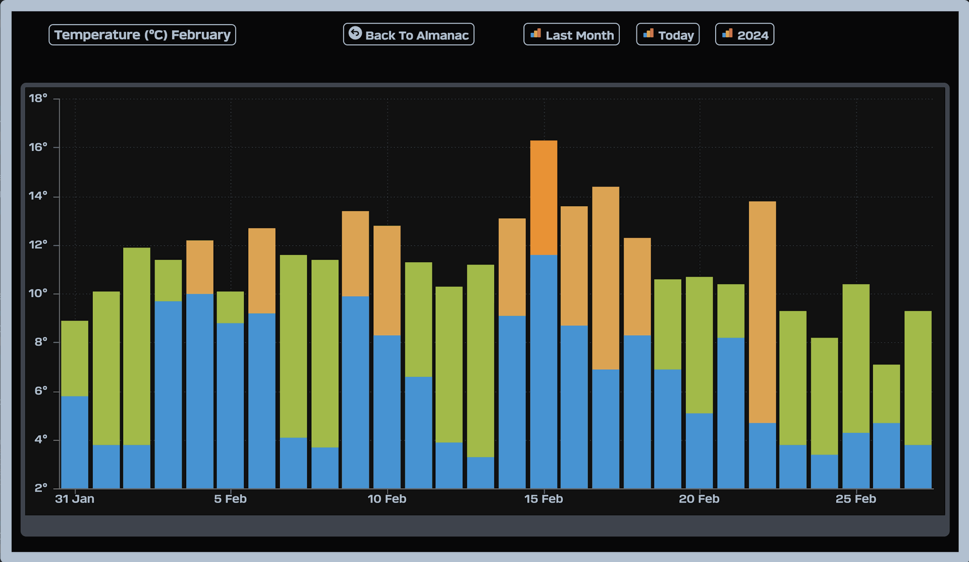 De gemiddelde temperatuur voor februari bedroeg 8,6 graden Celsius. Hoewel dit in lijn is met de gebruikelijke winterse temperaturen, werden we getrakteerd op enkele verrassend warme dagen. De maximumtemperatuur piekte op 16,3 graden Celsius, terwijl het kwik op koude nachten daalde tot een minimum van 2,9 graden Celsius.