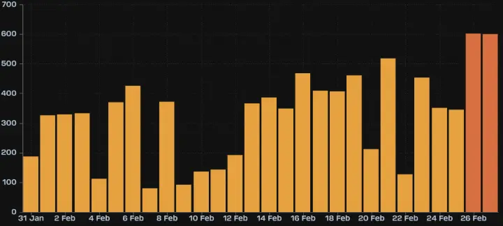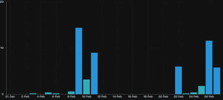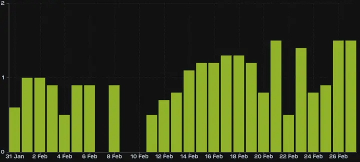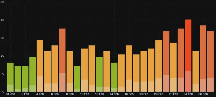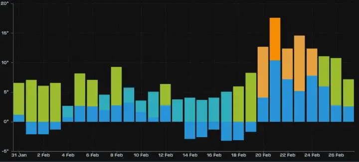 Na 23 februari zagen we een duidelijk herstel van de luchtkwaliteit, met op 25 en 27 februari zelfs de beste luchtwaarden van de hele maand. Dit kan samenhangen met veranderende meteorologische omstandigheden, zoals meer wind en neerslag die vervuilende deeltjes uit de lucht verwijderden.