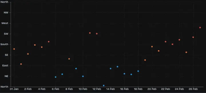 Naast de variërende windsnelheden, vertoonde de windrichting ook een interessante spreiding. De dominante richtingen gedurende februari waren afkomstig uit het zuiden en zuidwesten, wat vaak wijst op zachtere, vochtige luchtstromen. In de eerste helft van de maand waren er ook invloeden uit het noordoosten, wat duidt op koudere luchtstromen.