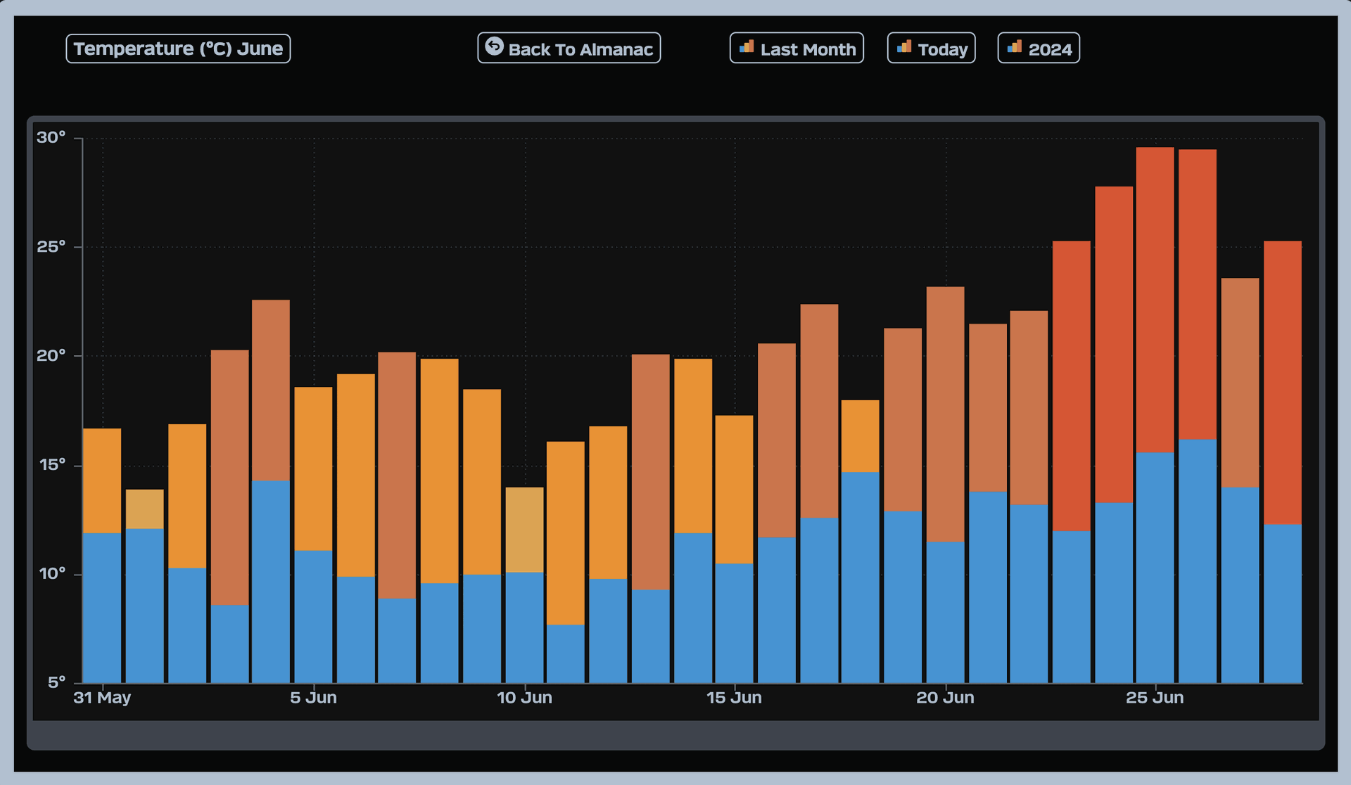 Welkom bij het maandoverzicht van juni 2024 voor MeteoTielt - WeerstationTielt. Deze maand kende wisselvallig weer met diverse weersomstandigheden. In dit overzicht bespreken we de temperatuur, regenval en windsnelheid van deze maand.