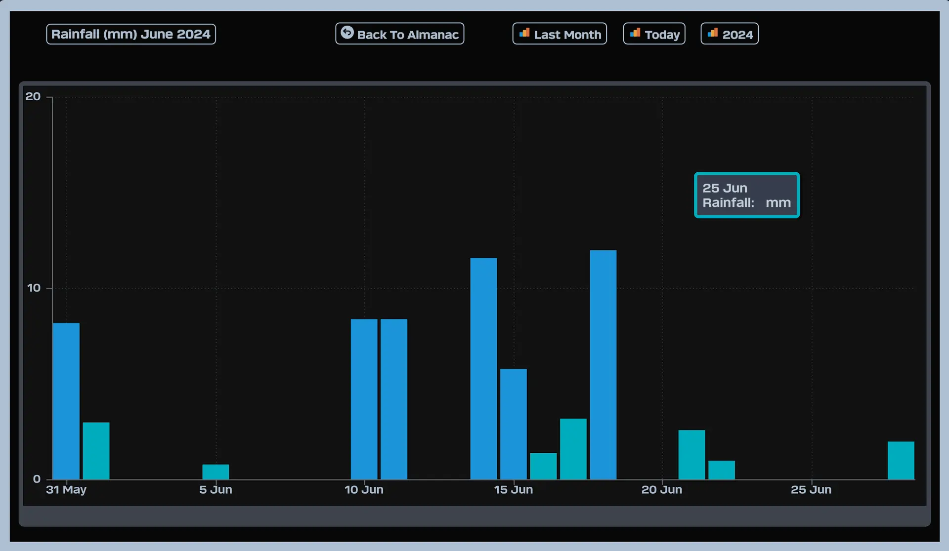 Juni bracht een totaal van 60,44 mm regen, verspreid over 12 dagen. De regenval was onregelmatig, met de meeste regenbuien in de eerste en derde week van de maand. Vooral op 10 en 20 juni viel er aanzienlijke regen. Deze natte dagen werden afgewisseld met drogere periodes, wat een wisselvallig patroon creëerde.