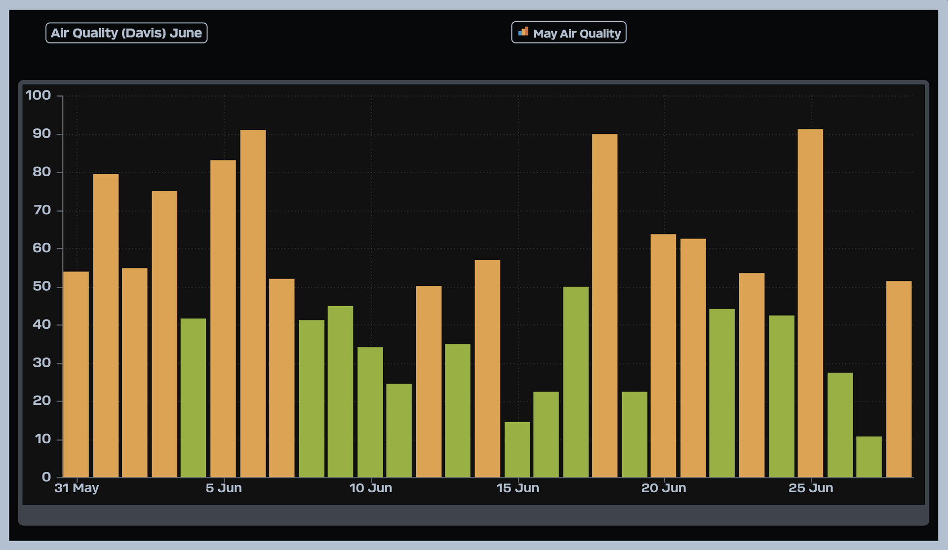 Over het algemeen wisselde juni tussen dagen van goede en matige luchtkwaliteit, maar de overwegende trend was positief, met meerdere groene dagen.