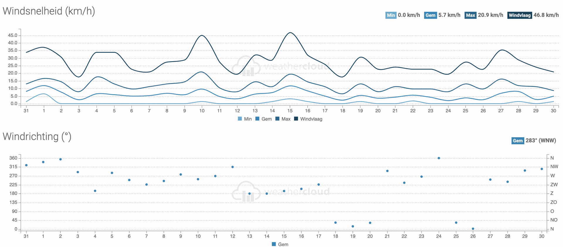 De windsnelheid varieerde deze maand, met een maximale snelheid van 45,1 km/h en rukwinden tot 46,7 km/h. De gemiddelde windsnelheid was 5,6 km/h. De windrichting bleef overwegend west-noordwest, wat typisch is voor deze tijd van het jaar. De windsterkte kende pieken rond de middagen van 4 en 15 juni, zoals te zien is in de bijgevoegde grafieken.