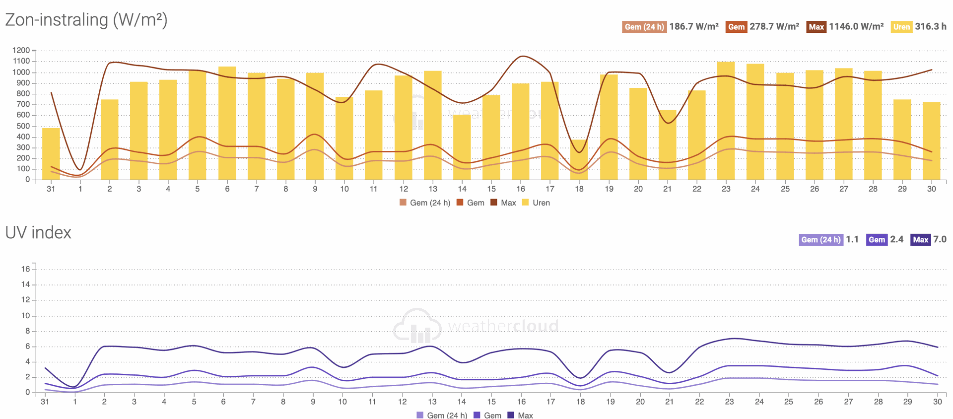 Het overzicht toont duidelijk dat, ondanks enkele dagen met lage waarden, juni over het algemeen een zonnige maand was met meerdere dagen van hoge zonstraling en bijbehorende UV-index.