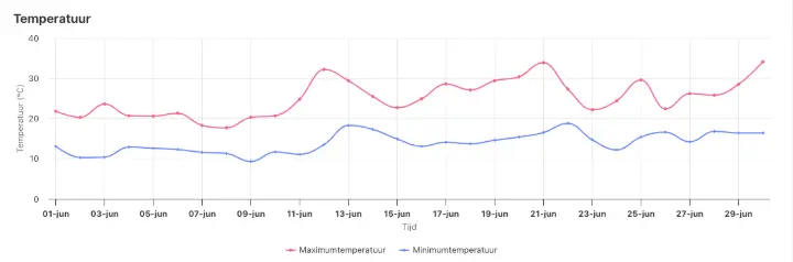 De gemiddelde temperatuur kwam uit op 19,4°C, wat past binnen een normale zomerse junimaand. De eerste dagen verliepen fris, met op 9 juni een minimum van 9,2°C. Vanaf half juni klom het kwik geregeld boven de 25°C. Op 30 juni werd zelfs een tropische piek van 34,3°C genoteerd – de warmste dag van de maand. Vooral tussen 15 en 25 juni kwamen meerdere zomerse en tropische dagen voor.