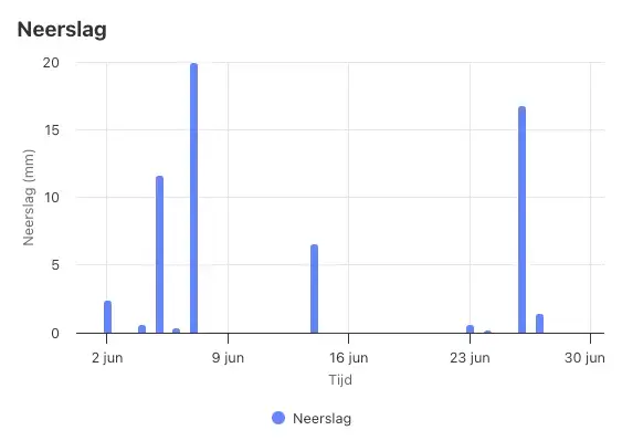 - Einde juni: stevige bui op 26 juni (~17 mm), gevolgd door lichte regen op 28 juni.