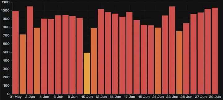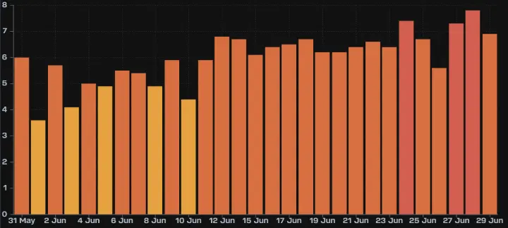 De UV-index varieerde tussen 5 en 7, met pieken boven de 7 op 25, 27 en 29 juni – dagen waarop extra zonnebescherming nodig was.
