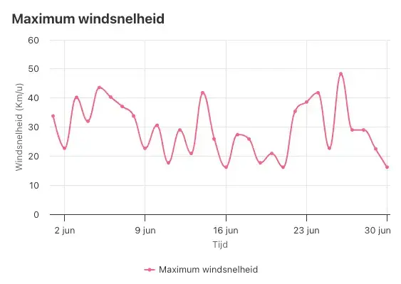 De wind kwam vooral uit het zuidwesten en westen. Gemiddelde snelheden lagen tussen 20 en 35 km/u, met uitschieters tot 48,3 km/u op 6 en 25 juni. Rustige dagen vielen op rond 11, 18 en 20 juni, met afwisselende windrichtingen en lagere snelheden.