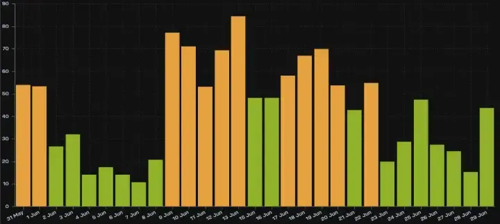 De luchtkwaliteit kende grote schommelingen. Tussen 9 en 14 juni waren er verhoogde vervuilingswaarden, met pieken boven de 85. Rond 15 juni volgde tijdelijk beterschap, maar daarna verslechterde de situatie opnieuw tot 21 juni. Na 22 juni was de lucht meestal weer schoon, met opvallend frisse dagen op 6, 8, 24 en 28 juni.
