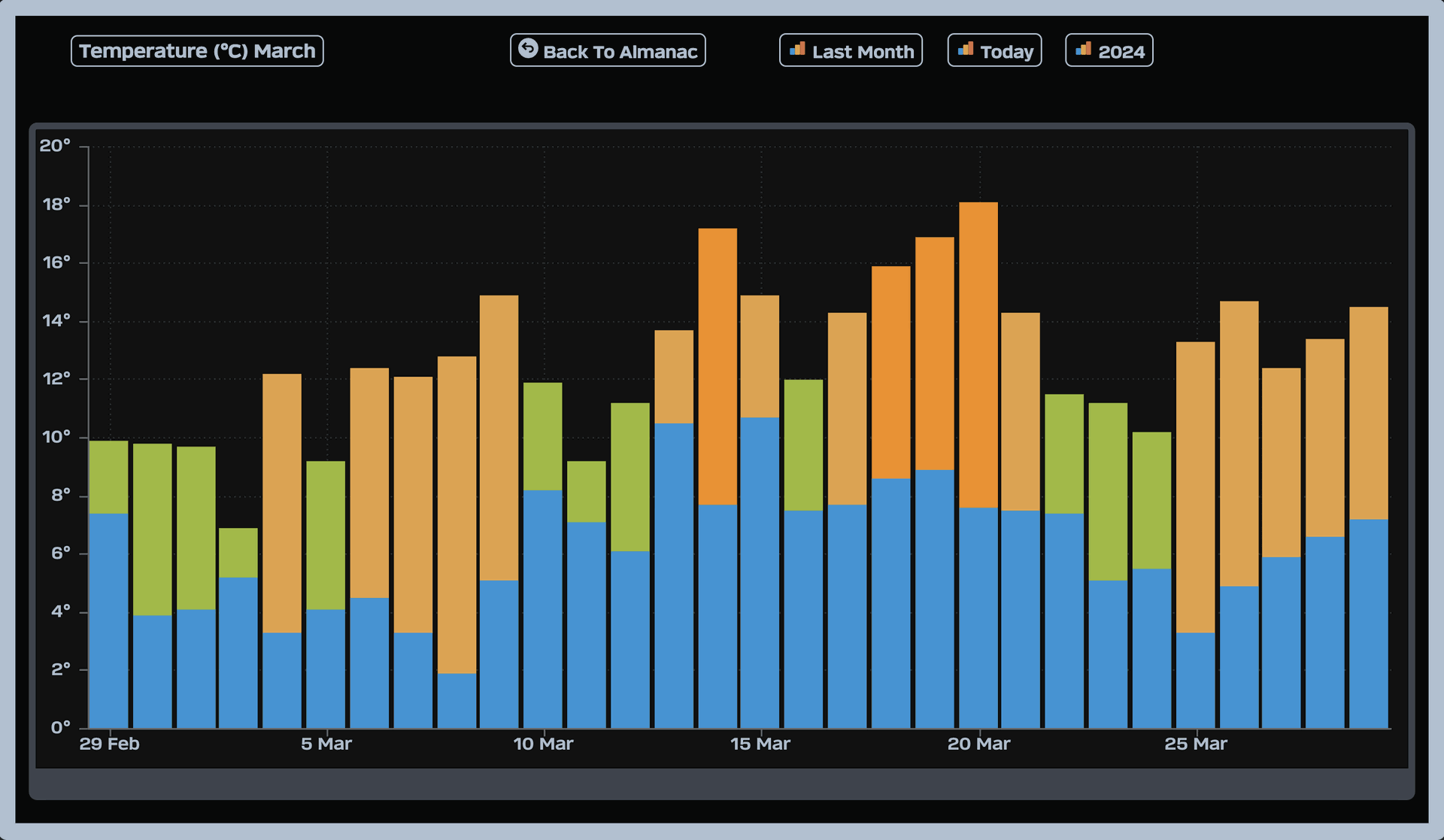 Maart 2024 bracht een mix van wisselvallig weer naar Tielt, met temperaturen die schommelden tussen milde dagen en koude nachten. Laten we eens een diepere duik nemen in de weerstatistieken van deze maand.