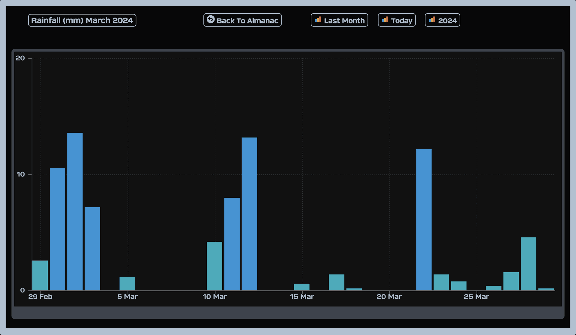 Maart bracht in totaal 94,22 mm regen naar onze regio, verspreid over 19 dagen van de 31. Dit resulteerde in een vochtige atmosfeer die bijdroeg aan het wisselvallige karakter van het weer gedurende de maand.