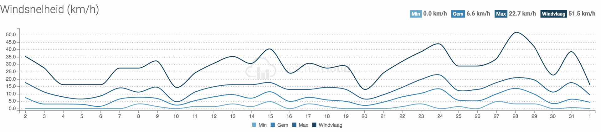- Aantal vorstdagen (minimum onder 0 °C) deze maand: 0 dagen