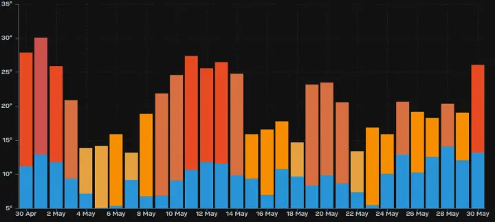 Mei startte warm – zéér warm. Op 2 mei werd in Tielt al meteen het maandrecord van 30,1°C genoteerd. Ook midden mei volgde een reeks zomerse dagen met maxima rond 26 à 28°C. Toch was het niet overal zomers: de nachten begin mei waren fris, met een minimum van slechts 5,1°C. De maand eindigde opnieuw met warm weer. Kortom, mei kende opvallende temperatuurpieken én dalen – typisch Belgisch lenteweer met zomerse flirtmomenten.