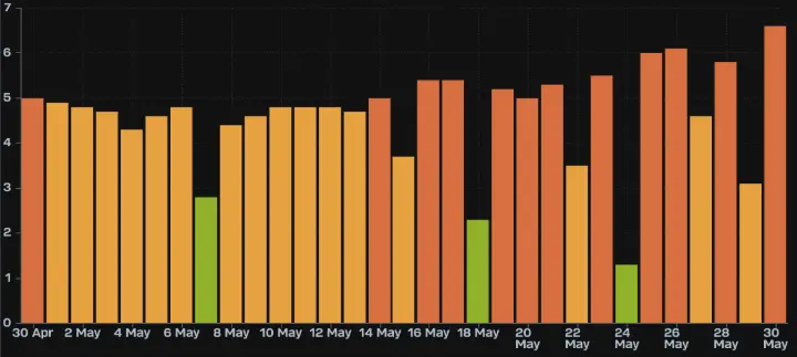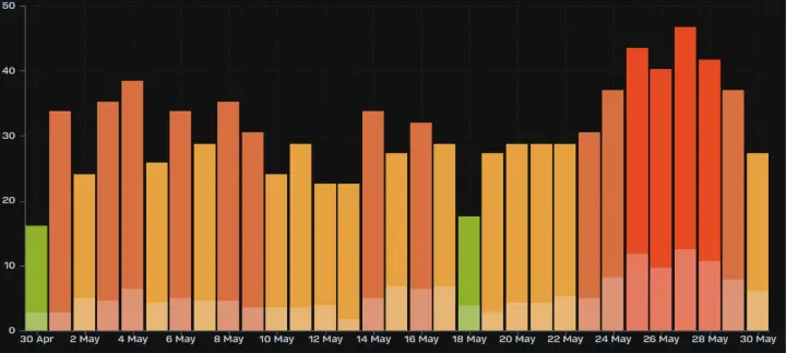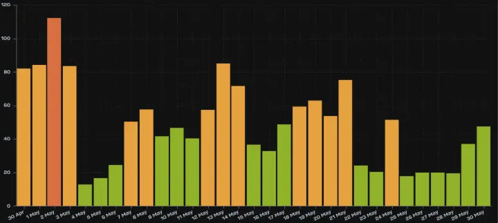 Begin mei liet de luchtkwaliteit te wensen over, met 2 mei als negatieve topper: meer dan 110 eenheden luchtvervuiling. Gelukkig verbeterden de waarden snel, met begin mei zelfs dagen onder de 30 eenheden – een duidelijke adempauze. Vanaf 8 mei fluctueerden de waarden opnieuw, met lichte pieken op 13 en 14 mei. De échte verbetering kwam pas in de laatste week, waar de luchtkwaliteit merkbaar beter werd en bleef.