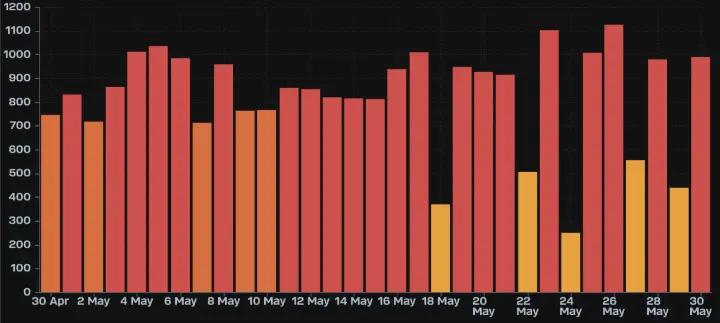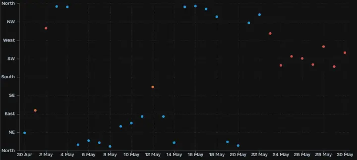 Ook op vlak van wind kreeg Tielt de volle laag in de laatste week van mei. Waar de eerste helft van de maand relatief kalm verliep met noordelijke winden, draaide de wind in de tweede helft naar het zuiden en zuidwesten. Dat ging gepaard met hoge snelheden: op 27 mei werd een piek gemeten van 43,6 km/u, met rukwinden tot 46,7 km/u. Tussen 24 en 29 mei lagen de snelheden vaak boven de 40 km/u – een winderig einde dus.