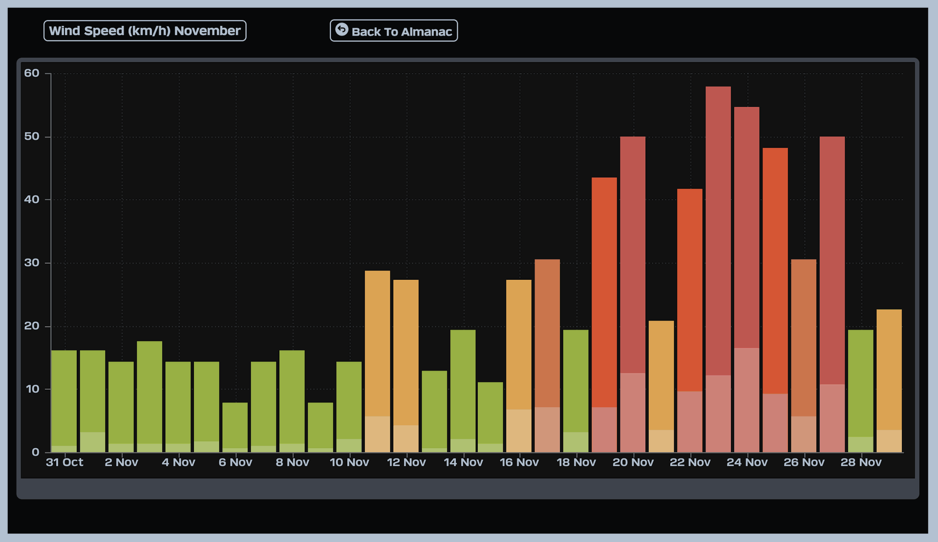• 24 november markeerde de dag met de hoogste windsnelheid van de maand: 54,7 km/h.