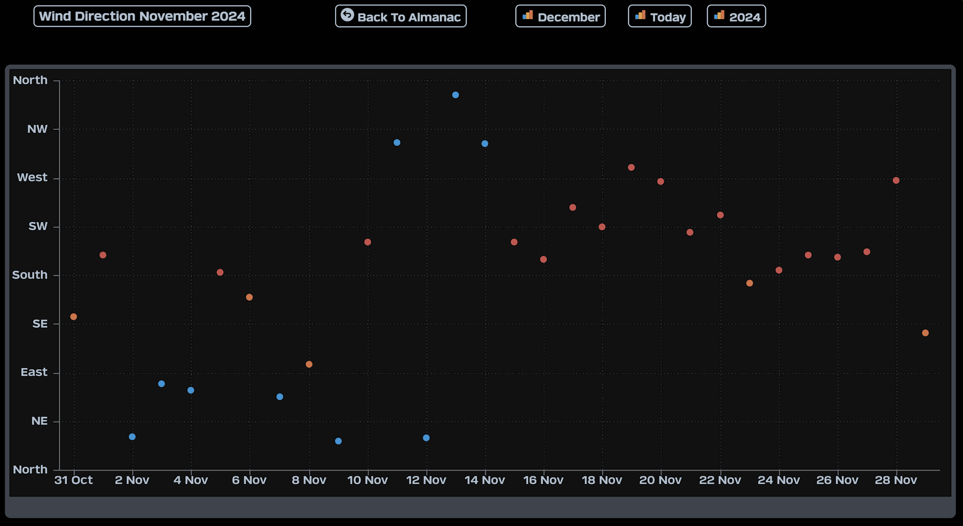 • Begin november was de wind vooral afkomstig uit het zuidoosten (SE) en zuidwesten (SW).