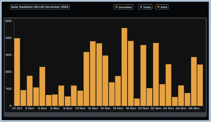 Na deze periode werd het weer meer wisselvallig. Halverwege de maand, rond 18 november, zagen we opnieuw een daling, maar de zon maakte snel een comeback met een tweede piek rond 20 en 22 november. De laatste dagen van de maand toonden opnieuw een patroon van afwisselende zonneschijn, waarbij vooral 28 en 29 november positief opvielen door hun heldere luchten.