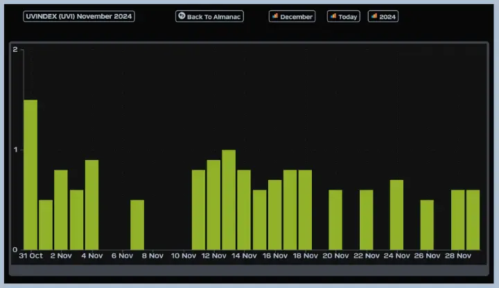 Vanaf 20 november en verder daalde de UV-index aanzienlijk, wat aangeeft dat de intensiteit van de zonnestralen zwak werd door de lagere zonnestand en waarschijnlijk een toename van bewolking.