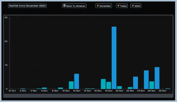 • Midden november (10-20 november): Rond 12 november was er een aanzienlijke neerslagpiek, gevolgd door een rustige periode. De grootste piek in de maand vond plaats op 20 november, toen bijna 30 liter op één dag werd gemeten.