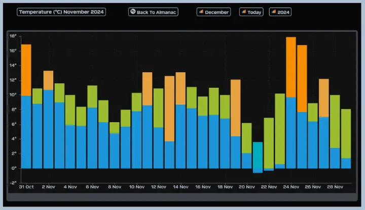 De laatste tien dagen van november begonnen koud, met de laagste temperaturen op 21 november. Maar verrassend genoeg volgde een opmerkelijke opwarming naar een warme piek van 17,9°C op 24 november. Daarna zakten de temperaturen geleidelijk, en de maand sloot af met overdag gematigde waarden en koude nachten.