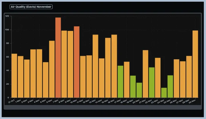 De eerste tien dagen van november waren relatief consistent, met een overwegend matige luchtkwaliteit. De waarden bleven grotendeels in het oranje gebied, met een piek op 7 november, waar de luchtkwaliteit significant verslechterde (donkeroranje balk). Deze periode kan mogelijk beïnvloed zijn door koude, stilstaande lucht die de ophoping van vervuilende stoffen bevorderde.